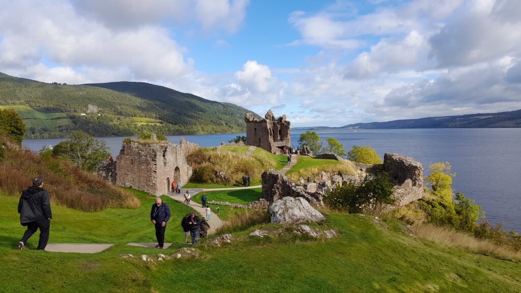 Wir fahren dann nach Urquhart Castel. Mit unseren Gestern online gebuchten Tickets kommen wir direkt rein. Es geht einen Stock tiefer und durch den Souvenir-Shop nach draußen auf die Anlage. Nadanjo fotografiert ein italienisches Paar mit einer Sofortbildkamera. Da ich Spaß mache, dass es nur die Kopie wäre, machen sie auch ein Foto von uns. Die Anlage ist weitläufiger als auf den ersten Blick. Auch haben sich die Gebäude und deren nutzen über die Zeit seit 500 nc verändert. Ein Grund, das oft nach Plünderungen nur Ruinen zurück blieben und dann nach langer Zeit neue Besitzer darauf aufbauten.