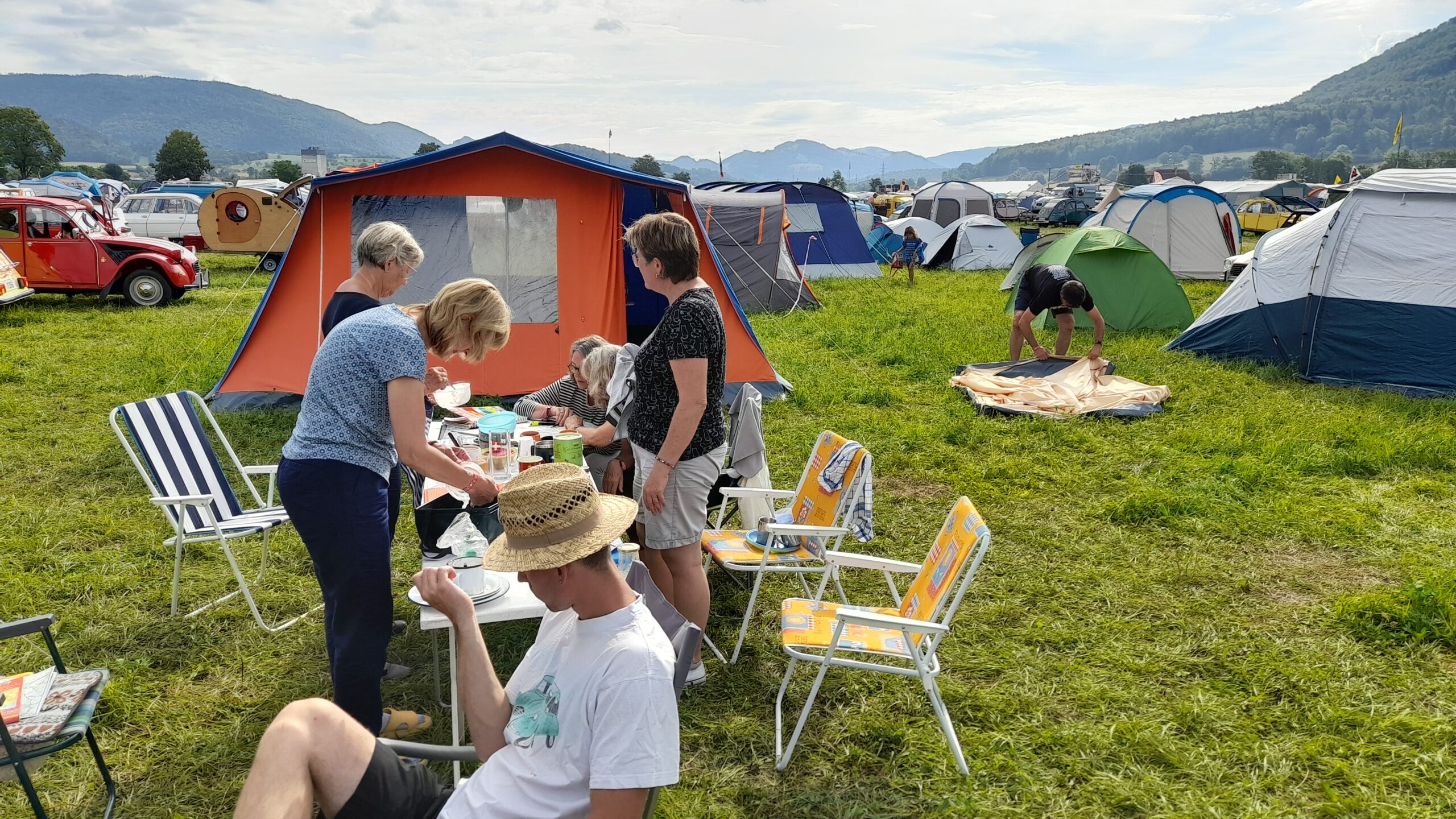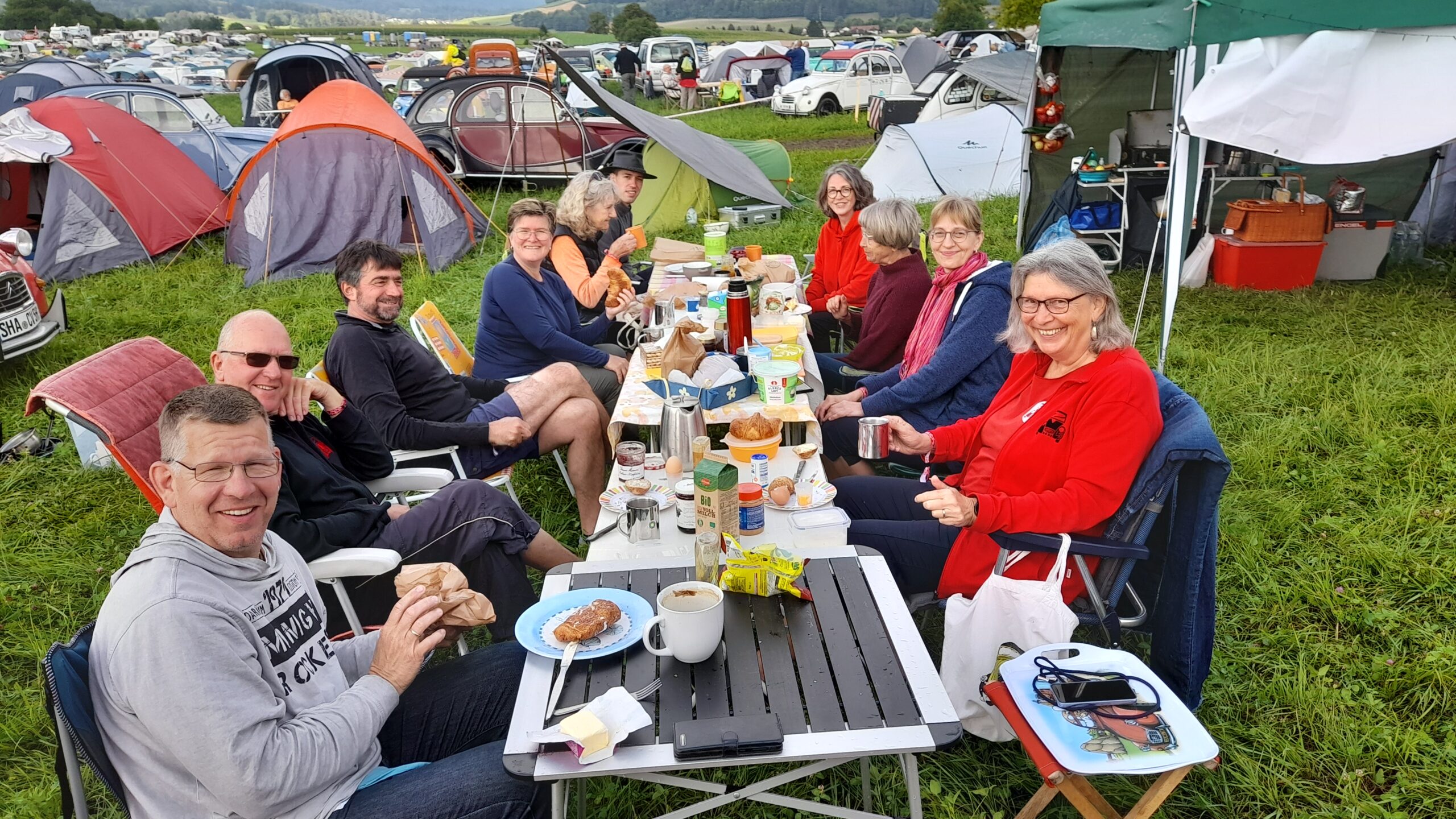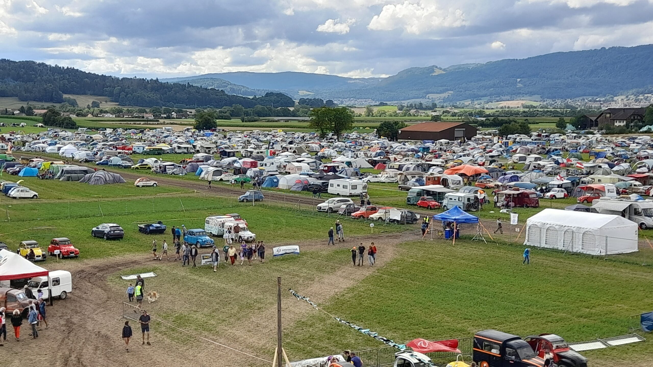 ![]() ![]() | Dienstag Delsberg, Delemont. Alles vorbereitet und gepackt, dass wir gegen 8 Uhr loskommen. Die Stecke geht mit ca. 50 km über kleine Straßen. So gegen 9 30 Uhr reihen wir uns ein in die Schlange zur Anmeldung. Der Platz ist noch relativ leer. Trotzdem werden Bereiche wehement verteidigt. Wir bauen auf und bereiten uns auf das kommende Gewitter vor. Wir schauen uns die Foodtrucks an und suchen uns was zum Essen raus. Dann beginnt auchcschonbdie Begrüßung der Teilnehmer. Alphörner und Bürgermeister und andere wichtige Personen halten reden. Abends spielt die Gruppe BronxX. Zum Abschluß sitzen wir bei Hannes im Zelt. |