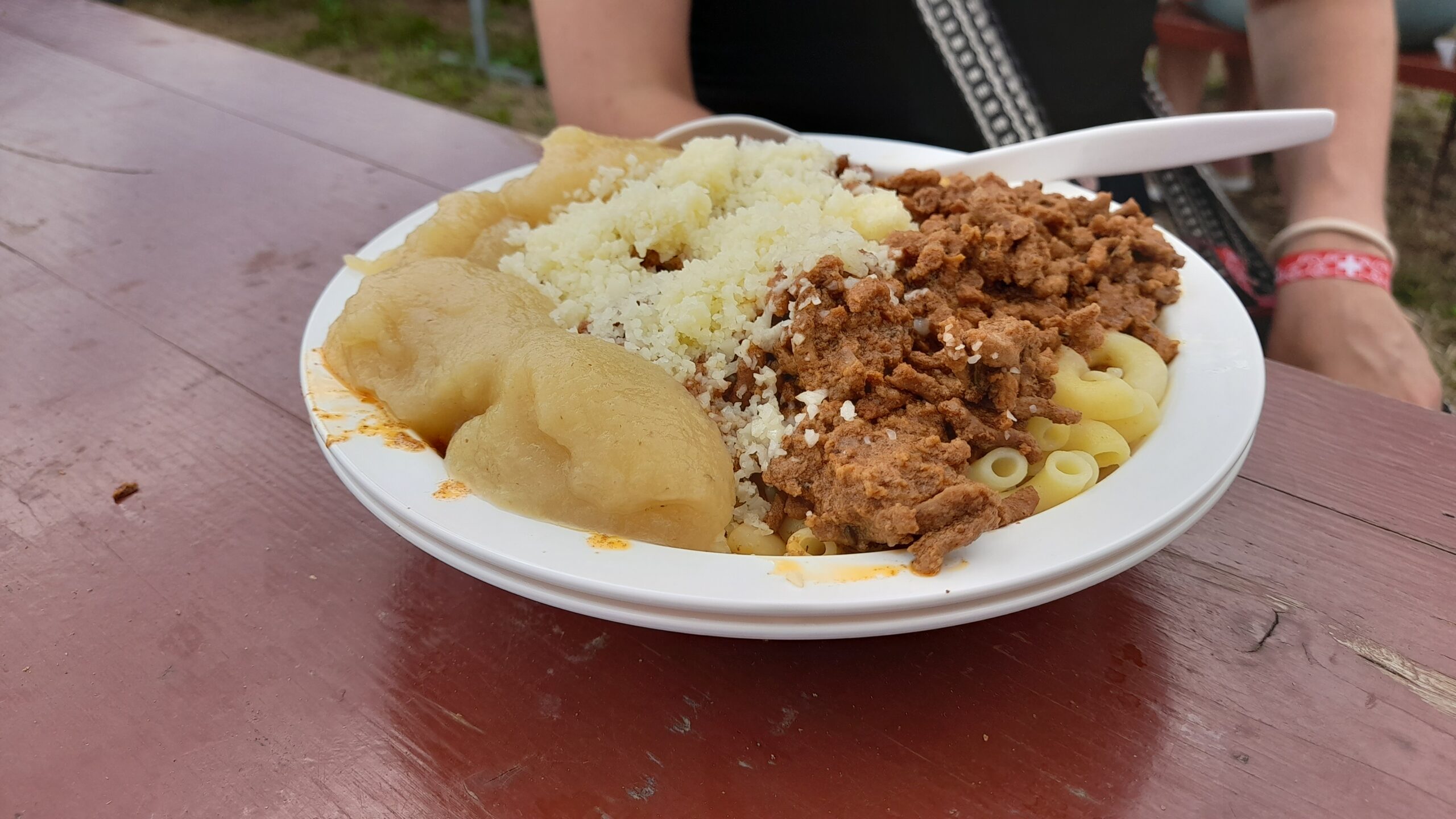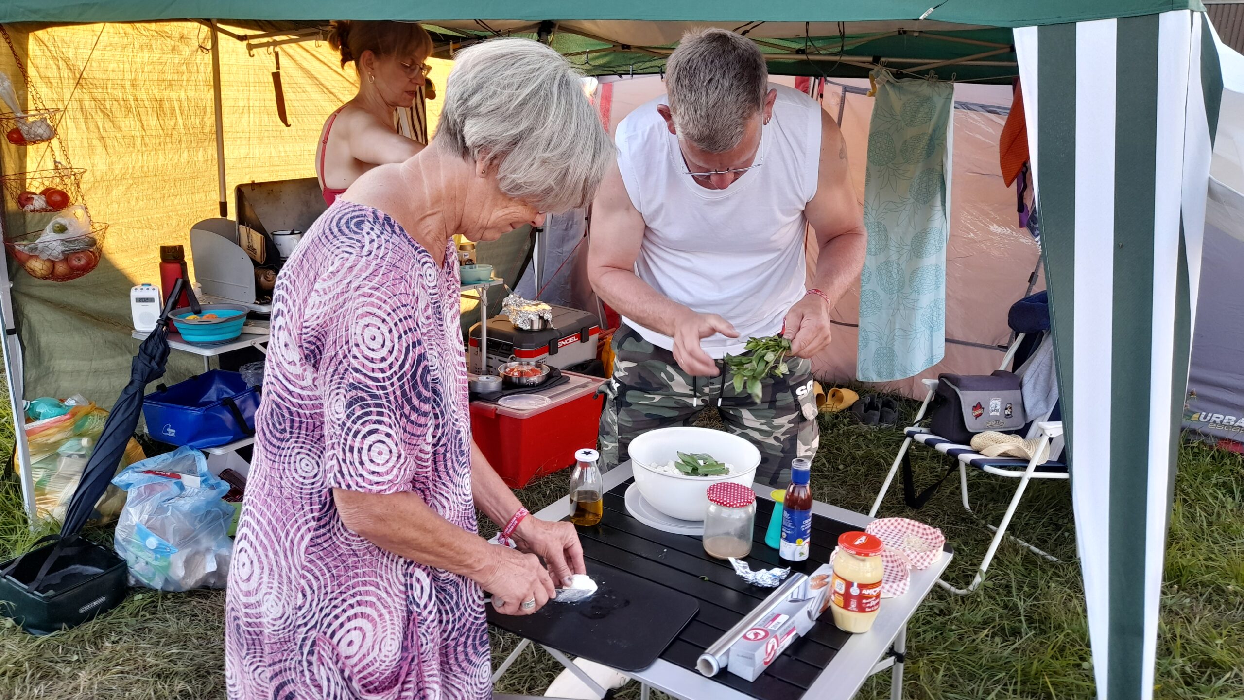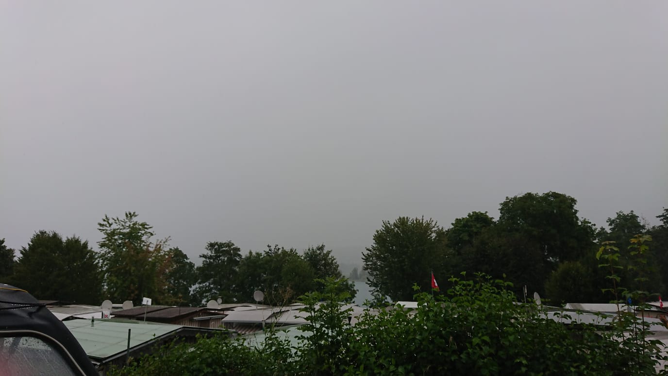 ![]() ![]() | Samstag Ententreffen. Einige von uns reisen heute ab. Wir gehen wieder vor an das Hauptzelt zum Essen. Hönli, gehacktes und Apfelmus. Dea hatte uns das als schweizer Spezialität empfohlen. Die Portion reicht für zwei. für 13 Uhr ist wieder regen angesagt. Ein Gewitter zieht kurz darauf durch. Um 17 Uhr tropfelt es immernoch. |